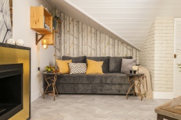 Когда вы планируете использовать в отделке много разных материалов, рисунков и фактур, обязательно должен быть объединяющий элемент. В этом интерьере им стал пол. Пробковый пол с печатью помог «собрать» интерьер в гармоничное пространство.