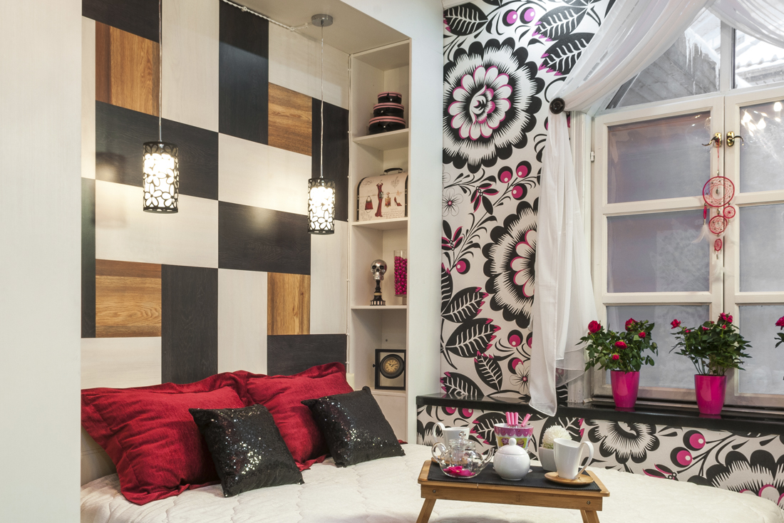 А теплый и спокойный оттенок пола очень хорошо уравновешивает яркие цвета и детали в отделке.