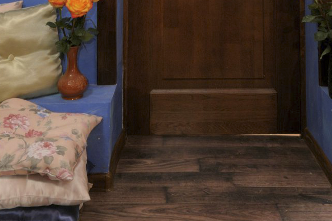 На полу мы видим сочетание камня и дерева, а на самом деле это пробка. Просто на нее нанесено изображение дерева и камня. Сочетать два таких разных материала было бы сложно, а пробка с печатью позволяет это сделать быстро и легко.